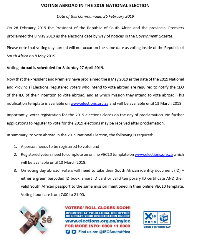 Between 26 February 2019 and 13 March 2019, and by way of submission of a VEC10 notification, registered voters who intend to vote abroad were required to notify the CEO of the IEC of their intention to vote abroad, and at which mission they intend to vote abroad. The VEC10 notification template was available on www.elections.org.za but is now closed for voting in the national election of 2019.